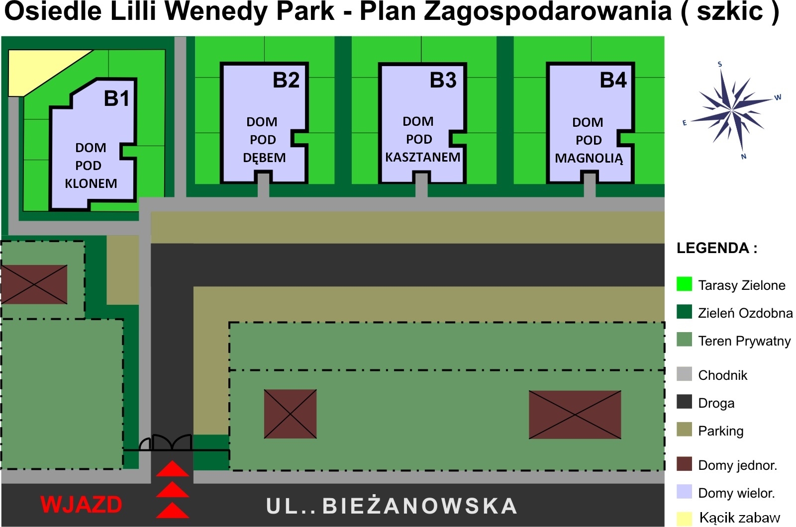 Szkic zagospodarowania osiedla Lilli Wenedy Park umożliwia orientację na terenie działki.